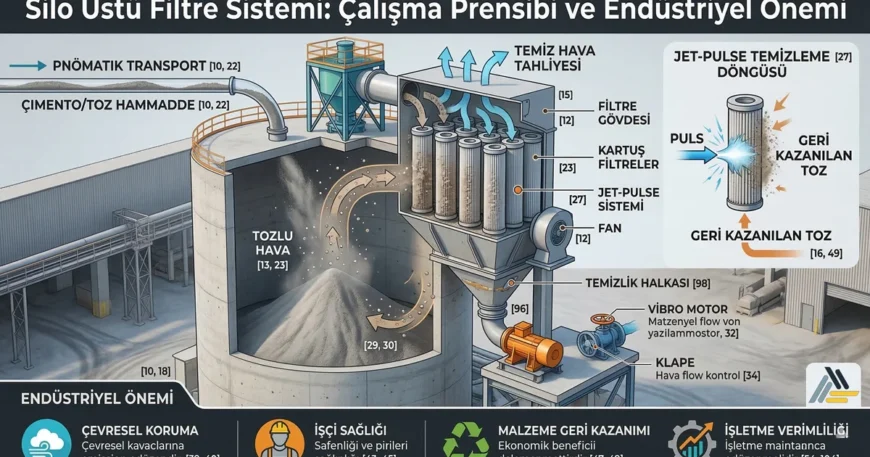 Silo Üstü Filtre Sistemi, çimento, kireç, alçı, uçucu kül, kum gibi tozlu malzemelerin depolandığı siloların dolumu sırasında oluşan tozlu havanın arındırılması için tasarlanmış özel ekipmanlardır. Bu sistemlerin temel amacı, silo içerisine malzeme aktarılırken yer değiştiren havanın taşıdığı ince partikülleri yakalayarak çevreye yayılmasını engellemektir. Bir filtre sistemi tipik olarak bir filtre gövdesi, filtre elemanları (kartuş veya torba filtreler), otomatik temizleme mekanizması (genellikle jet-pulse sistemi), bir fan ve bir kontrol panelinden oluşur.
